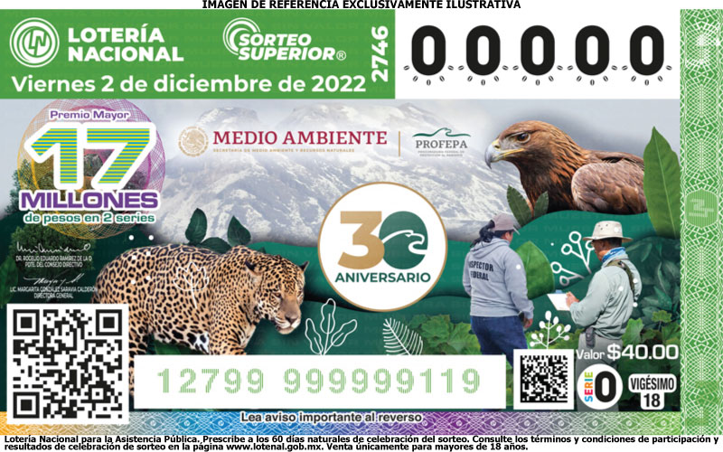 La Procuraduría Federal de Protección al Ambiente (PROFEPA), que este año llega a su 30° aniversario, mismo que celebramos a través del billete de Lotería de este Sorteo Superior 2746, a celebrarse este viernes 02 de diciembre de 2022. La Procuraduría Federal de Protección al Ambiente (PROFEPA) es un órgano administrativo desconcentrado de la Secretaría de Medio Ambiente y Recursos Naturales (SEMARNAT) con autonomía técnica y operativa. Su nacimiento data del 4 de junio de 1992, fecha en la que el Diario Oficial de la Federación publicó el Reglamento Interior de la Secretaría de Desarrollo Social que la crea. La PROFEPA tiene como tarea principal incrementar los niveles de observancia de la normatividad ambiental, a fin de contribuir al desarrollo sustentable y hacer cumplir las leyes en materia ambiental.