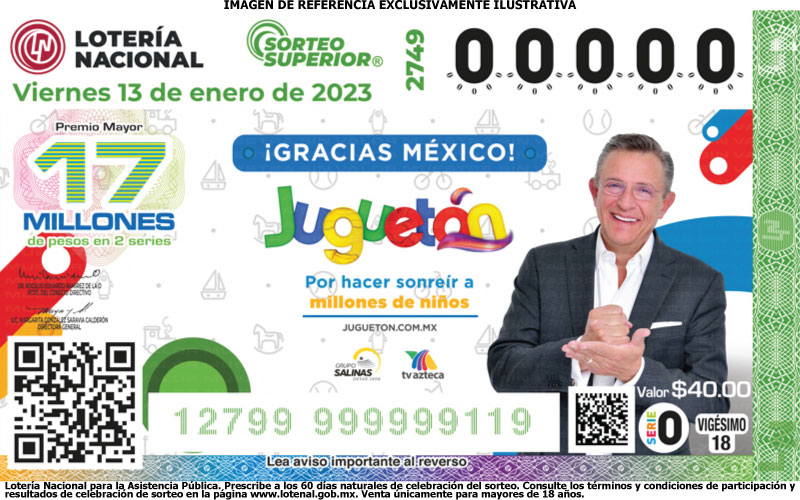 El Sorteo Superior No. 2749 otorga un premio Mayor de 17 millones y dando un premio principal con una serie de 8 millones y medio. El costo de la fracción o cachito es de $40.00; mientras que el costo de la serie o entero es de $800.00. *Con el sorteo Superior 1 de cada 5 gana un premio o reintegro.