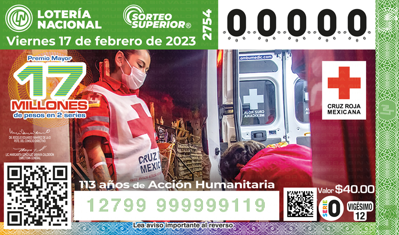 El Sorteo Superior No. 2754 otorga un premio Mayor de 17 millones y dando un premio principal con una serie de 8 millones y medio. El costo de la fracción o cachito es de $40.00; mientras que el costo de la serie o entero es de $800.00. *Con el sorteo Superior 1 de cada 5 gana un premio o reintegro.