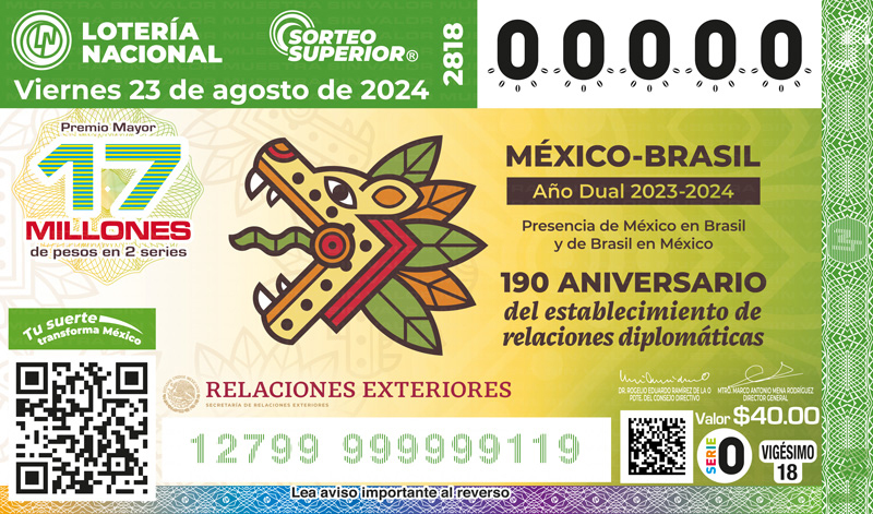 La emisión del billete de la Lotería Nacional y el sorteo mismo, formarán parte del programa de actividades del Año Dual 2023-2024 "Presencia de México en Brasil y de Brasil en México", que tiene el propósito de conmemorar el 190 aniversario del establecimiento formal de relaciones diplomáticas entre México y Brasil (30 de mayo de 2024), así como promover y potenciar una nueva etapa de hermanamiento y solidaridad entre las dos naciones.??