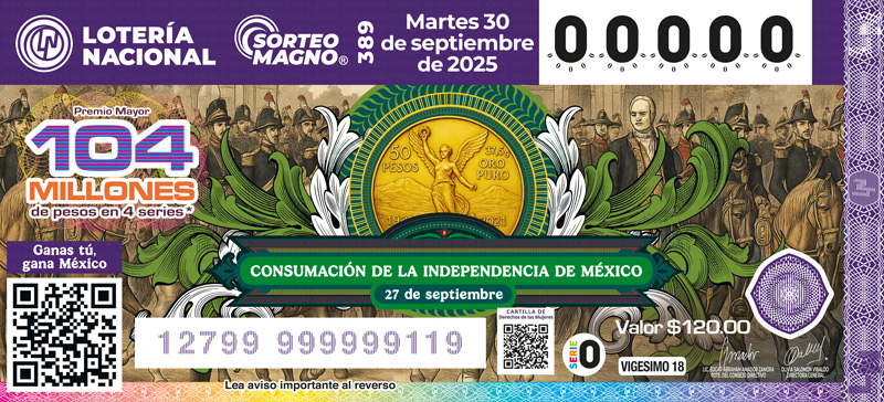 La Consumación de la Independencia de México, alcanzada el 27 de septiembre de 1821, marcó el momento en que, tras más de una década de lucha, se consolidó el anhelo de libertad del pueblo mexicano. Ese día, el Ejército Trigarante, encabezado por Agustín de Iturbide y Vicente Guerrero, entró triunfante a la Ciudad de México, sellando así el fin del dominio colonial y el inicio de una nación soberana. La gesta independentista fue posible gracias al esfuerzo colectivo de hombres y mujeres que, desde distintas regiones y condiciones sociales, aportaron valor, ideas y sacrificio para construir un país libre. Con la entrada del Ejército Trigarante se materializaron los ideales de Independencia, Unión y Religión, principios que quedaron plasmados en el Plan de Iguala y que dieron forma a los cimientos de nuestra nación. Este hecho no solo significó la ruptura con tres siglos de dominación española, sino también el nacimiento de una nueva identidad nacional, donde la diversidad cultural, la valentía y el espíritu de unidad se convirtieron en las bases de México. Para Lotería Nacional, conmemorar la Consumación de la Independencia a través de su Sorteo Magno es rendir homenaje a la historia y a los valores que dieron origen a nuestro país. A través de sus sorteos, billetes y actividades culturales, Lotería Nacional se convierte en un puente entre la memoria histórica y la vida cotidiana de millones de mexicanos, recordando que la esperanza, la unión y la libertad siguen siendo causas vigentes que fortalecen nuestra identidad nacional. Principales Premios por serie 1 Premio de 26 millones por serie 1 Premio de 3 Millones por serie 3 Premios de 1.430.600 cada uno por serie 4 Premios de 500 mil cada uno por serie 4 Premios de 225 mil cada uno por serie Además de más premios directos, por aproximación, por terminación y reintegros, con una suma total de premios de más de 82 millones de pesos.