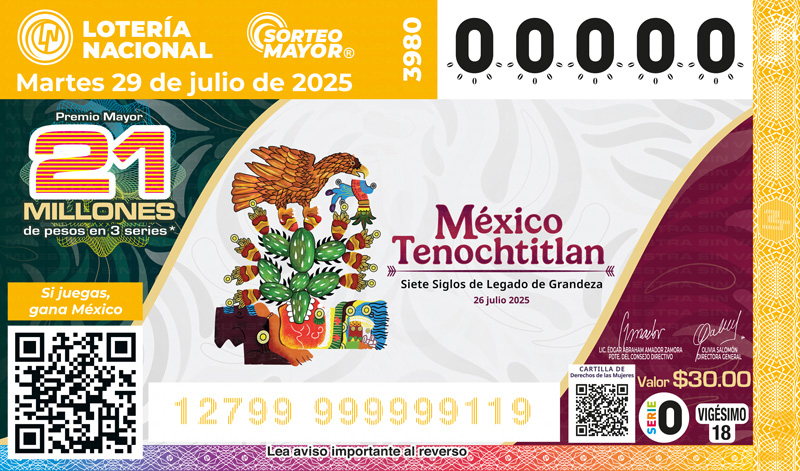 Conmemorar los 700 años de la fundación de México-Tenochtitlan es reconocer la relevancia histórica y cultural de una de las civilizaciones más emblemáticas de la historia universal, así como del corazón mismo de nuestra identidad como mexicanas y mexicanos. Esta gran ciudad, surgida de la visión, la fuerza y la sabiduría del pueblo mexica, fue mucho más que una capital: fue centro político, económico, religioso y cultural que asombró al mundo por su organización, su arte y su profundo conocimiento del entorno. A través de este sorteo, la Lotería Nacional celebra la memoria viva de México-Tenochtitlan, sus raíces profundas y su legado que, siete siglos después, sigue latiendo en el alma de nuestra nación. Sembrar grandeza es reconocer que las huellas de este pasado ancestral siguen presentes en nuestras lenguas originarias, nuestras tradiciones, nuestro sentido de comunidad y nuestro espíritu de resistencia. Cada billete de este sorteo es una semilla de memoria, un tributo a una ciudad que no desapareció, sino que se transformó para seguir habitando nuestro presente. Que este reconocimiento inspire orgullo, reflexión y unidad entre todos los mexicanos.