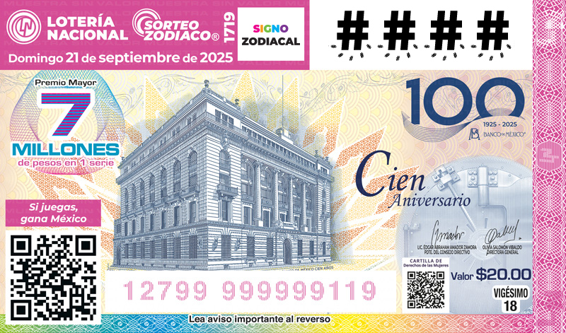 El diseño del billete de Lotería conmemora el Centenario del Banco de México, institución fundada el 25 de agosto de 1925. En la composición gráfica se destaca el grabado del emblemático edificio principal de este Instituto Central, ubicado en Av. 5 de mayo No. 2, construido entre 1903 y 1905 por el arquitecto Theodore de Lemos, con ingeniería de Gonzalo Garita y A.R. Whitney, posteriormente, adaptado y renovado en 1926 por Carlos Obregón Santacilia y Francisco Ramos en estilo art déco, para alojar al Banco Central de nuestro país. A su vez, el billete de Lotería muestra una vista exterior de la puerta de la bóveda principal, que fue instalada dentro de este mismo inmueble durante las renovaciones de 1926. Por último, se incorpora el logotipo conmemorativo del centenario del Banco de México. El logotipo conformado por el número “100”, que simboliza el centenario del Banco de México. En su parte inferior central, se despliegan líneas curvas estilizadas y entrelazadas con el número 100, que evocan el movimiento dinámico de los billetes al pasar por un contador, representando tanto la función primordial y característica del Banco como el flujo constante de la economía nacional. En la esquina derecha inferior de este elemento se integra el logotipo institucional del Banco de México y encima de este, se incluyen los años conmemorativos “1925 – 2025”, que enmarca el periodo histórico de los cien años de existencia de la institución. Además, combina elementos gráficos contemporáneos con símbolos de tradición, proyectando solidez, continuidad y evolución. El Banco de México, en su acta constitutiva y Ley Orgánica, tiene cuatro finalidades esenciales: proveer a la economía del país de moneda nacional; procurar la estabilidad del poder adquisitivo de la moneda; promover el sano desarrollo del sistema financiero; y propiciar el buen funcionamiento de los sistemas de pagos. A lo largo de su historia, el Banco ha hecho realidad estas finalidades mediante: la emisión y circulación organizada del peso mexicano; el diseño de billetes seguros y auténticos; la implementación de un marco monetario sólido para preservar el valor de la moneda; el impulso a la robustez del sistema financiero; y la creación de infraestructuras eficientes de pago, como el SPEI. Estos logros llenan de sentido cada trazo del billete de Lotería: el edificio representa la identidad institucional y cultural del Banco Central; la bóveda, símbolo de resguardo y de la confianza institucional que Banco de México brinda a la sociedad mexicana; y el logotipo, el orgullo centenario. En conjunto, el diseño celebra el legado de una institución que ha sostenido la estabilidad económica de México por un siglo.